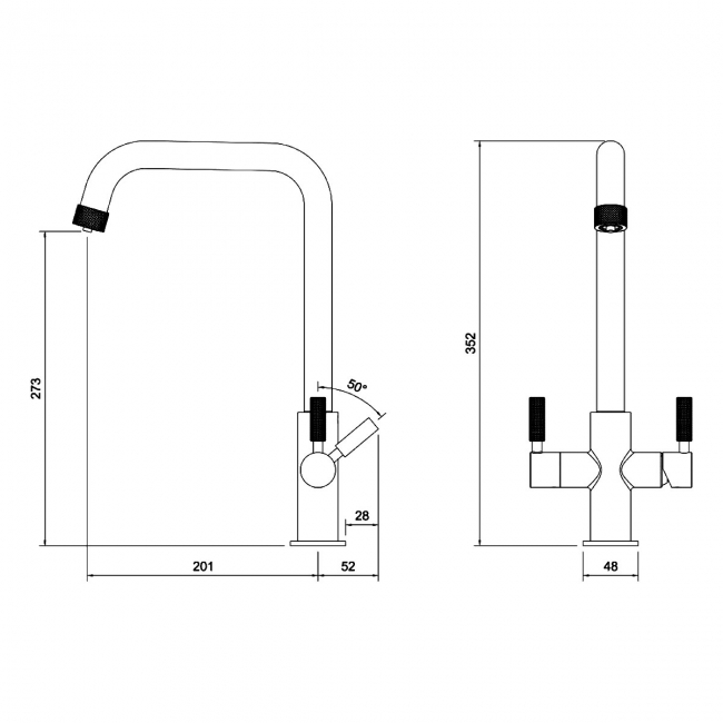 • Striking industrial chic designed mixer with matching slimline, knurled handles and a base spout detail that delivers hot, cold, and heated filtered water