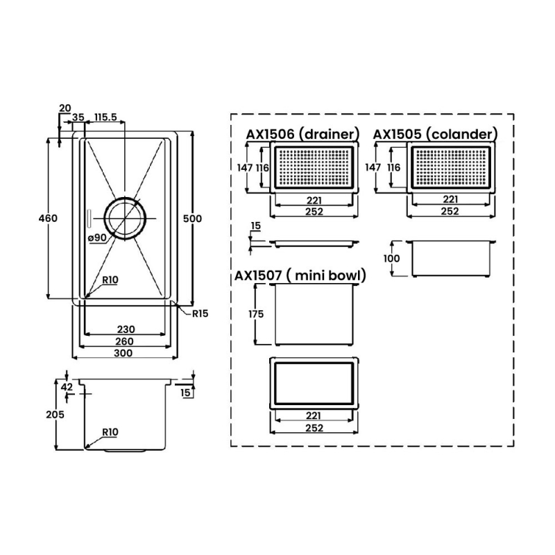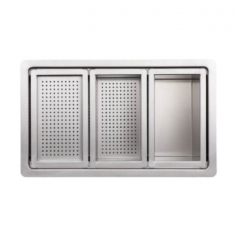 • Included parts: Waste with short bolt, rectangular overflow, undermount clips x 6, studio colander, studio drainer, studio mini bowl and bowl pipework