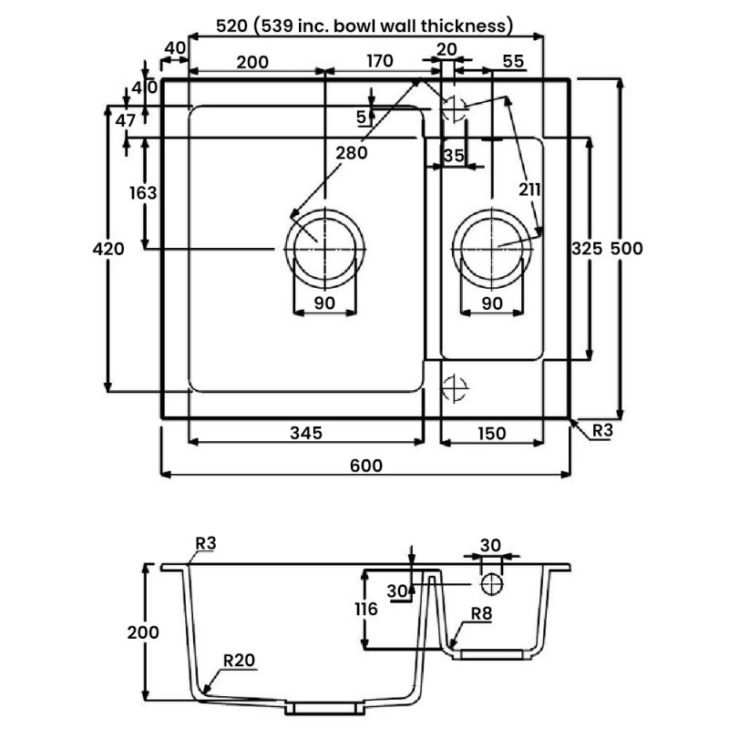 Secondary Bowl Depth116mm