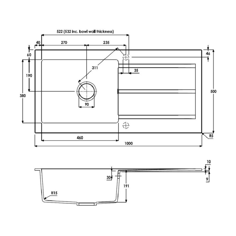• Included parts: Waste with long bolt, composite inset fixing clips x 8, round overflow pipework and bowl pipework