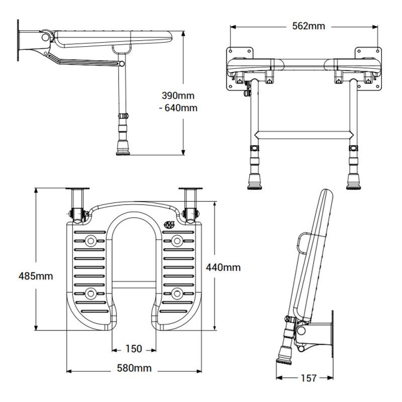 • Seat heights of between 390-640mm (provided by two sets of legs supplied as standard) - can be adjusted at the point of installation