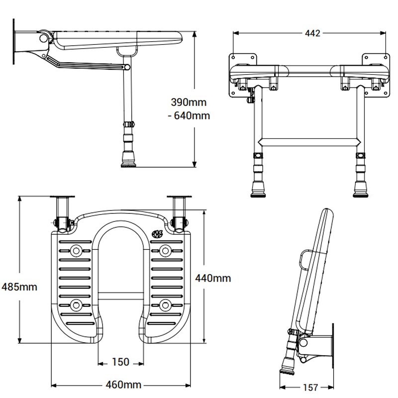 • Seat heights of between 390-640mm (provided by two sets of legs supplied as standard) - can be adjusted at the point of installation