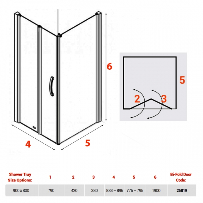• Supplied with 1x900mm wide bi-fold door,1x800mm wide side panel