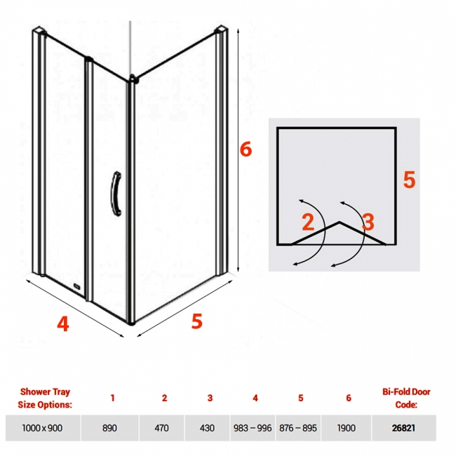 • Supplied with 1x1000mm wide bi-fold door,1x900mm wide side panel