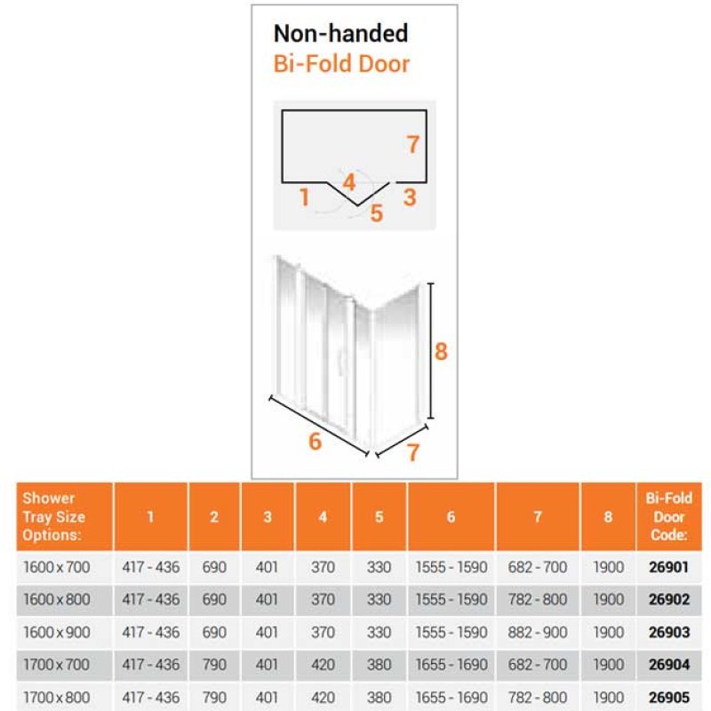 • Supplied with 1x800mm wide bi-fold door,1x700mm wide side panel and 2x400mm wide in-line panel