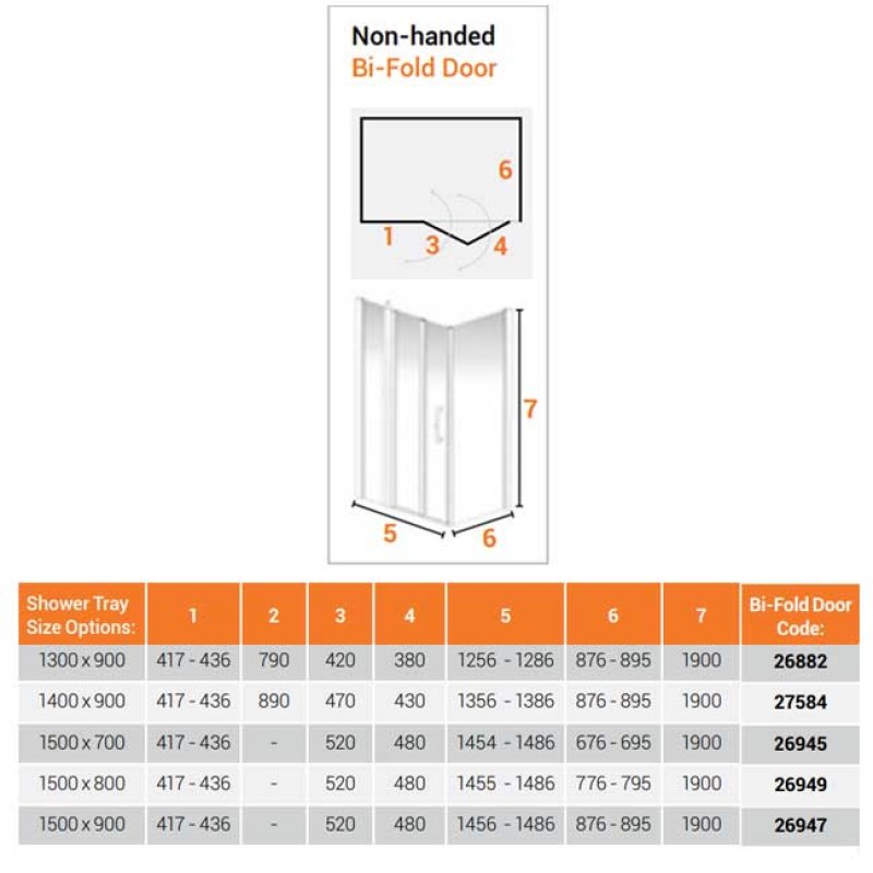 • Supplied with 1x1100mm wide bi-fold door,1x700mm wide side panel and 1x400mm wide in-line panel