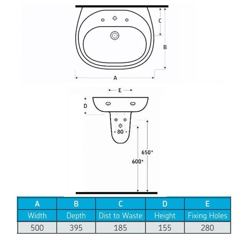AKW Livenza Basin and Semi Pedestal 500mm Wide - 2 Tap Hole | Product Image AKW Livenza Basin and Semi Pedestal 500mm Wide - 2 Tap Hole