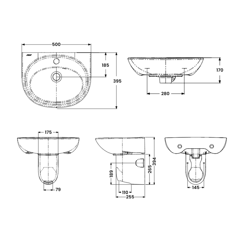 AKW Livenza Plus Basin and Semi Pedestal 500mm Wide - 1 Tap Hole