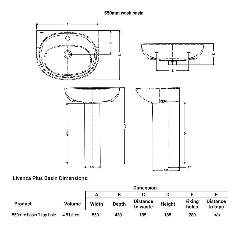 AKW Livenza Plus Basin with Full Pedestal 550mm Wide - 1 Tap Hole