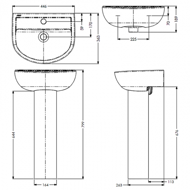 AKW Navlin Basin With Full Pedestal 450mm Wide - 1 Tap Hole