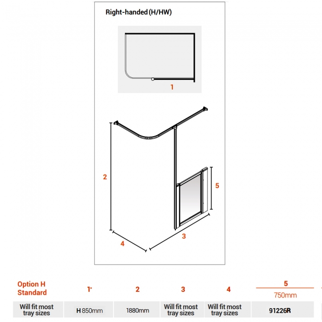 AKW Option H 750 Shower Screen 850mm Wide - Right Handed AKW Option H 750 Shower Screen 850mm Wide - Right Handed