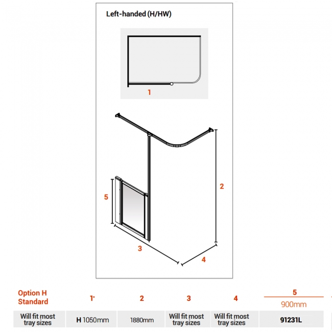 AKW Option H 900 Shower Screen 1050mm Wide - Left Handed