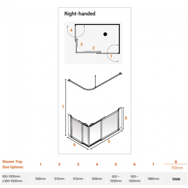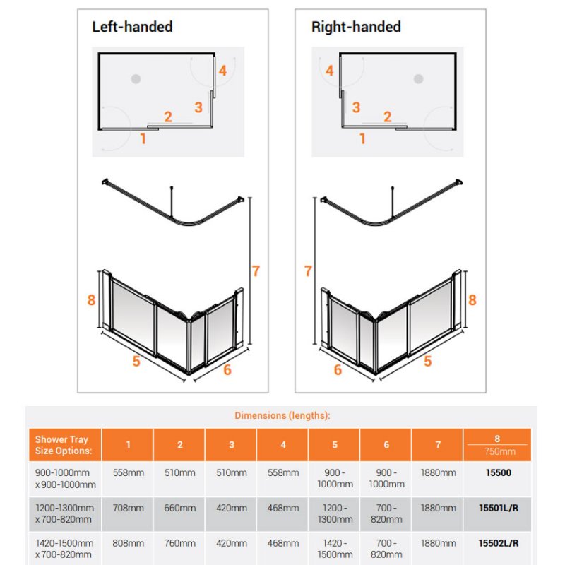 • 180 degree hinges on single doors and 360 degree hinges on bi-folding doors - Enables the doors to open both inwards and outwards providing easy access for the user in smaller bathrooms