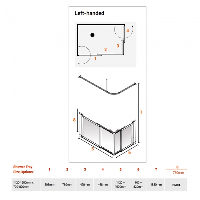 • 180 degree hinges on single doors and 360 degree hinges on bi-folding doors - Enables the doors to open both inwards and outwards providing easy access for the user in smaller bathrooms