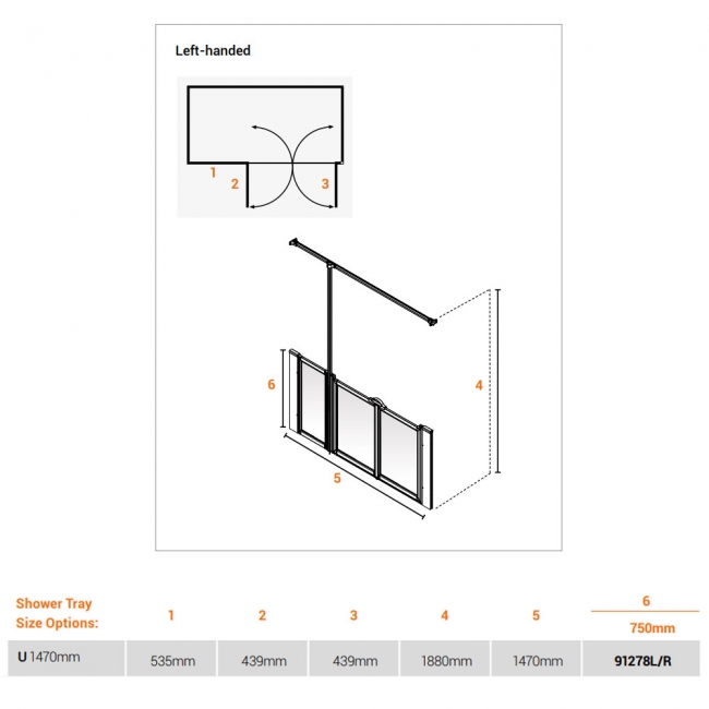 AKW Option U 750 Shower Screen 1470mm Wide - Left Handed
