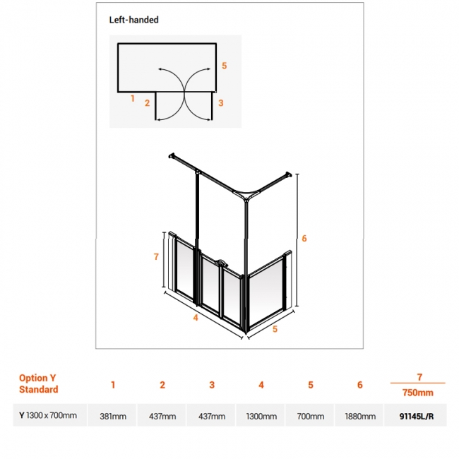 AKW Option Y 750 Shower Screen 1300mm x 700mm - Left Handed