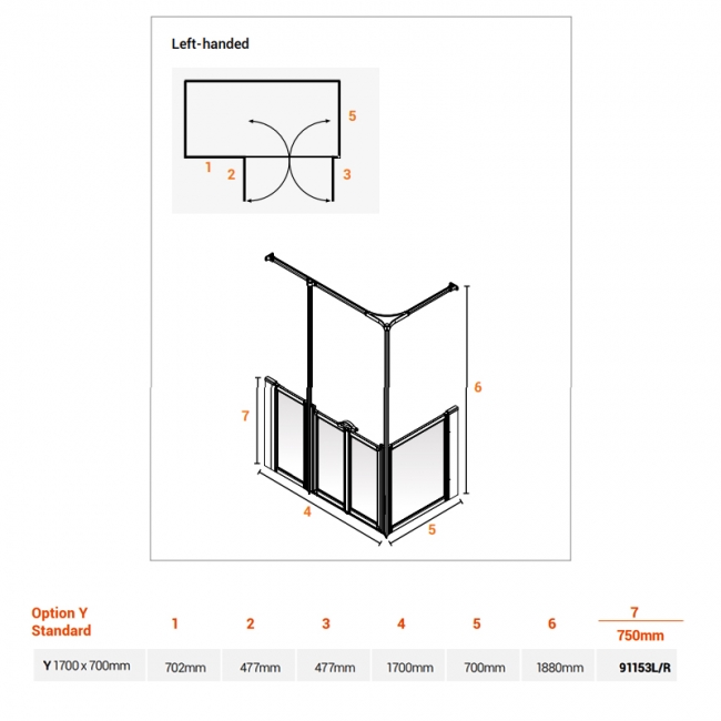 AKW Option Y 750 Shower Screen 1700mm x 700mm - Left Handed