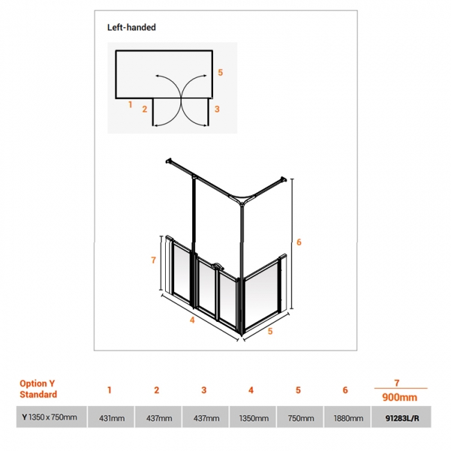 AKW Option Y 900 Shower Screen 1350mm x 750mm - Left Handed