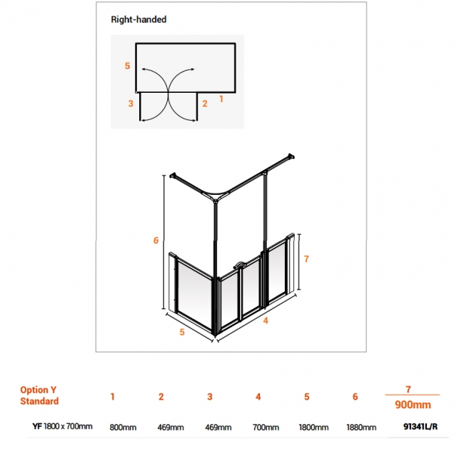 AKW Option Y 900 Shower Screen 1800mm x 700mm - Right Handed