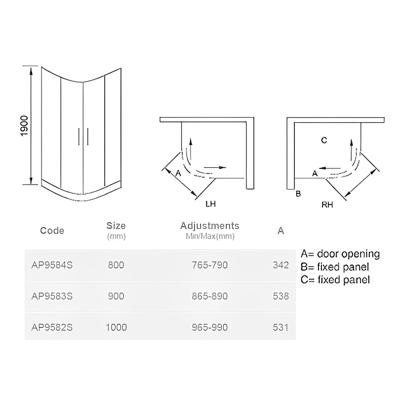 Width/Depth/Radius: The most popular quadrant enclosure sizes are undoubtedly the 800x800 and 900x900 measurements, though some 1000x1000 quads are available, as well as various bespoke sizes in between. Our best-selling quadrant size is 800mm x 800mm. However, we recommend trying to install the largest size possible for your space. It should be noted that these sizes are all nominal, and every quadrant surround includes an adjustment range that allows for installation on uneven walls. Nearly all of the models on the market are manufactured to be compatible with a 550 radius tray - 550 being the length from the corner until the point where the curve starts. Whilst most shower trays/bases are compatible, we recommend choosing a tray from the same brand where possible, for ensured compatibility.