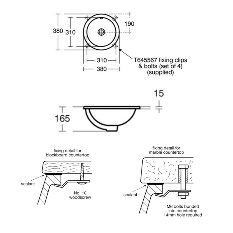 • Washbasin mounted on underside of countertop using fixing clips provided