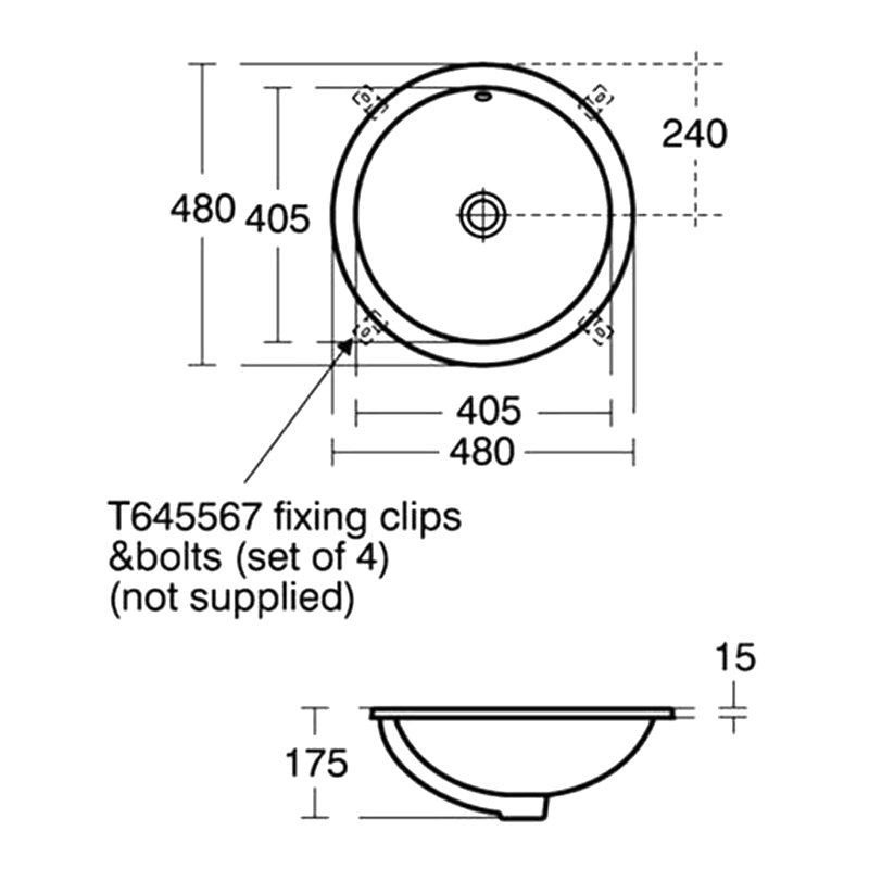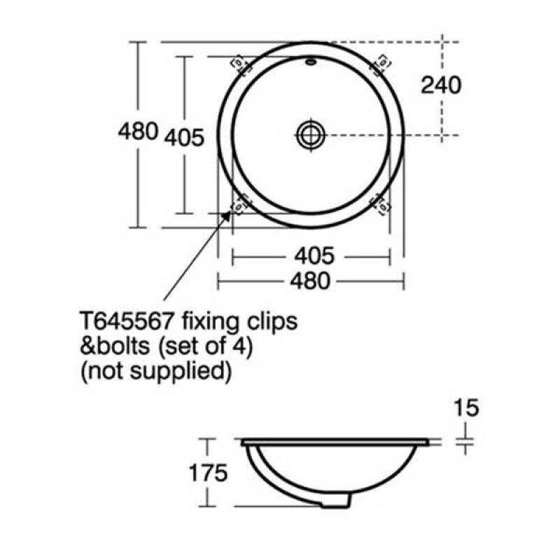 • Washbasin mounted on underside of countertop using fixing clips provided