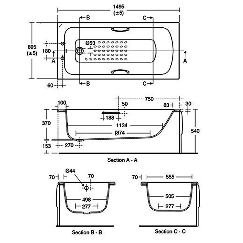 The Armitage Shanks Sandringham 21 Bath measures 1500mm x 700mm and includes two tap holes, integrated handgrips, and includes the leg set. Its tread pattern has been thoughtfully designed to help reduce the risk of slipping under normal use. While this offers an added sense of reassurance, users should still take care when entering or exiting the bath. With its durable construction and practical design, this bath suits both domestic and commercial settings. A bath waste, taps and bath panel can be bought separately to complete the look.