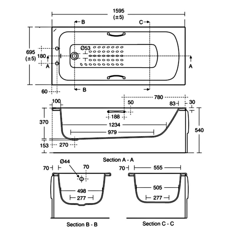 The Armitage Shanks Sandringham 21 Bath measures 1600mm x 700mm and includes two tap holes, integrated handgrips, and includes the leg set. Its tread pattern has been thoughtfully designed to help reduce the risk of slipping under normal use. While this offers an added sense of reassurance, users should still take care when entering or exiting the bath. With its durable construction and practical design, this bath suits both domestic and commercial settings. A bath waste, taps and bath panel can be bought separately to complete the look.