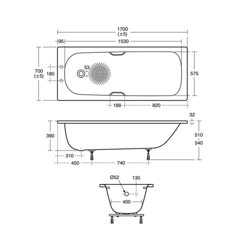 Armitage Shanks Sandringham 21 Rectangular Steel Bath with Grips 1700mm x 700mm - 2 Tap Hole (inc Leg Set) | Product Image Armitage Shanks Sandringham 21 Rectangular Steel Bath with Grips 1700mm x 700mm - 2 Tap Hole (inc Leg Set)