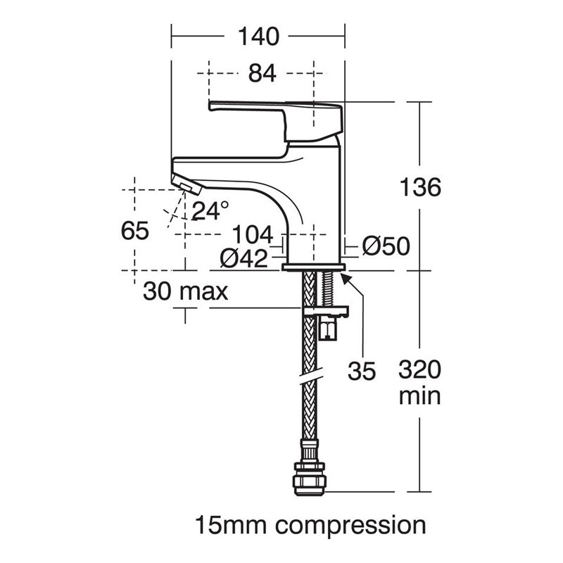• Centre of inlet to centre of outlet is 104mm