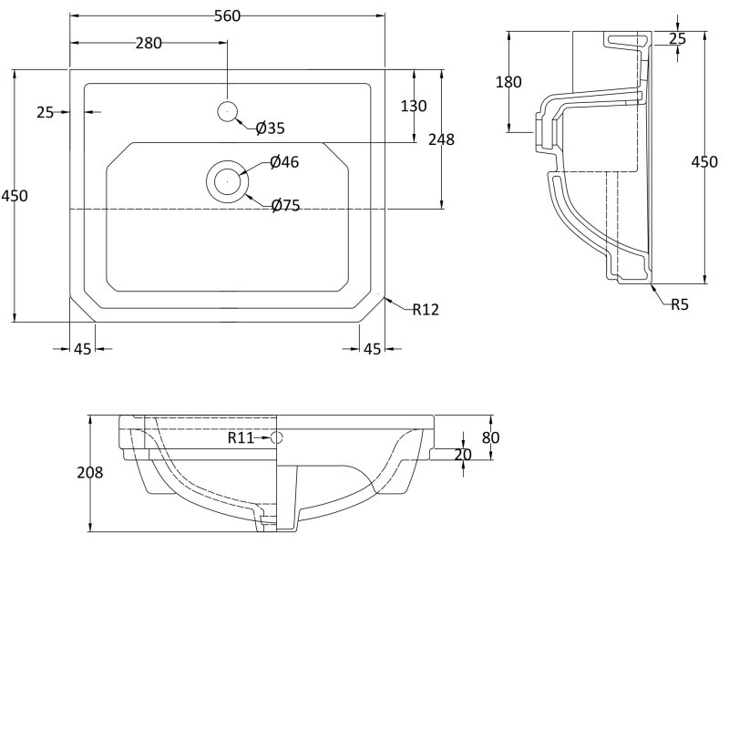 Bayswater Fitzroy Semi Recessed Basin 560mm Wide - 1 Tap Hole | Product Image