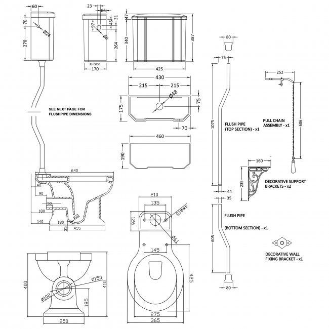 • Supplied as an easy-to-order pack consisting of high level toilet pan, flush pipe kit and pull chain cistern