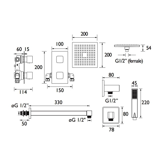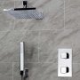 - It has a 200mm square fixed head with shower arm; a single function handset and hose with integral handset holder and wall outlet