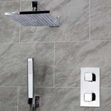 This shower pack has soft square handles on our Colbalt shower valve with integral two outlet diverter. It has a 200mm square fixed head with shower arm; a single function handset and hose with integral handset holder and wall outlet.