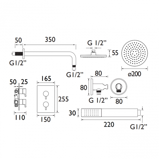 • Supplied complete with Dual Concealed Valve, Fixed Shower Head with Shower Arm and Shower Handset with Hose