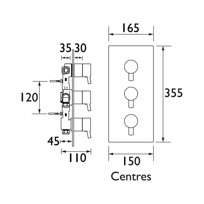 • Top control operates two shower outlets, centre adjusts temperature, bottom control operates the other shower outlet