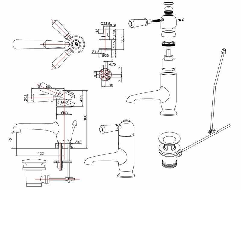 • Bayswater Crosshead Hex Basin Taps Pair - White/Chrome - Colour Swatch - Black