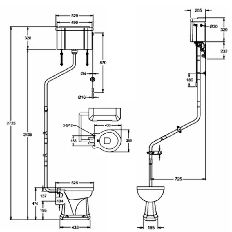 Bayswater Fitzroy High Level Toilet with Pull Chain Cistern - Excluding Seat