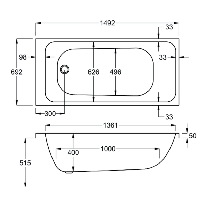 Carron Profile Single Ended Rectangular Bath 1500mm x 700mm - 5mm Acrylic