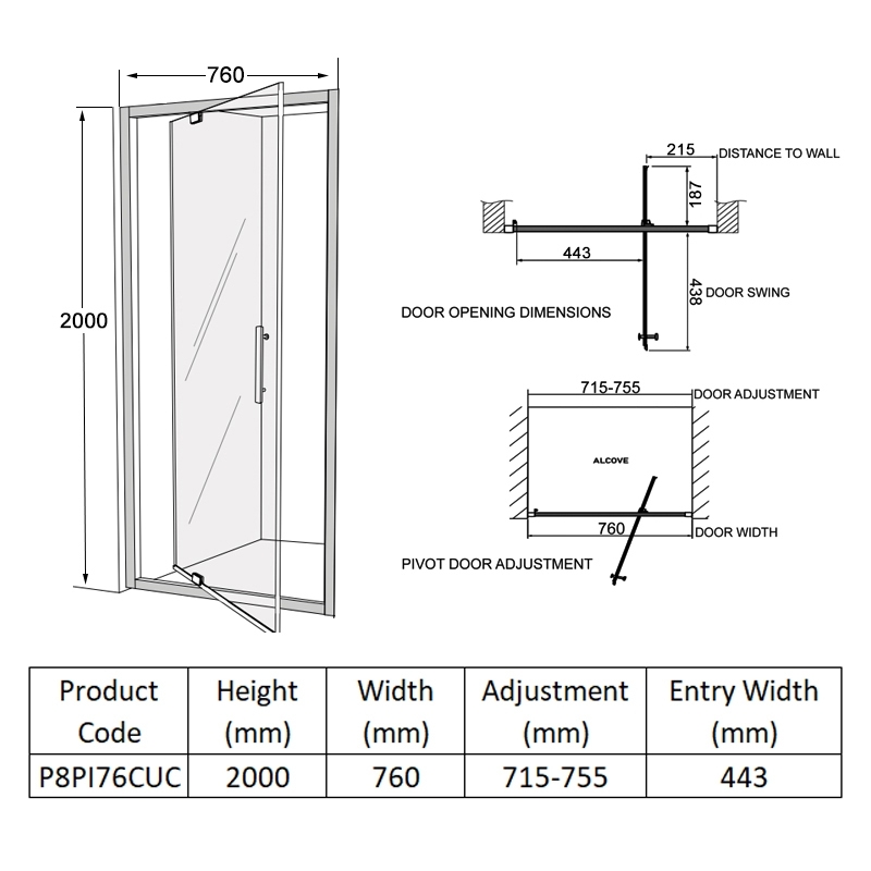 Door Frame Adjustment 715mm - 755mmSide panel extra if required for corner installation