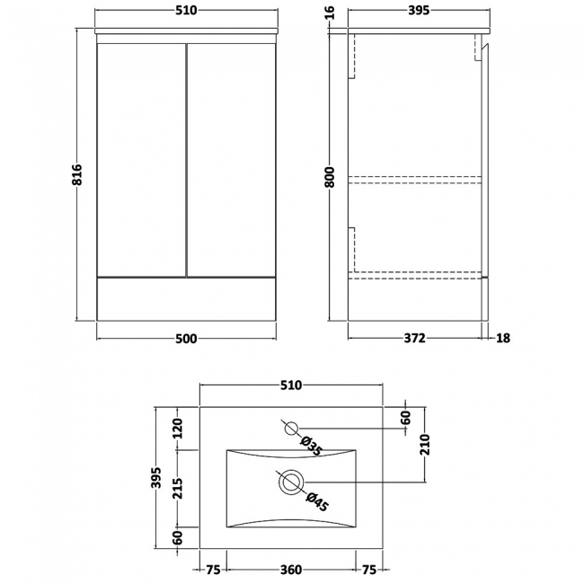 Total Width (Unit + Basin)510mm