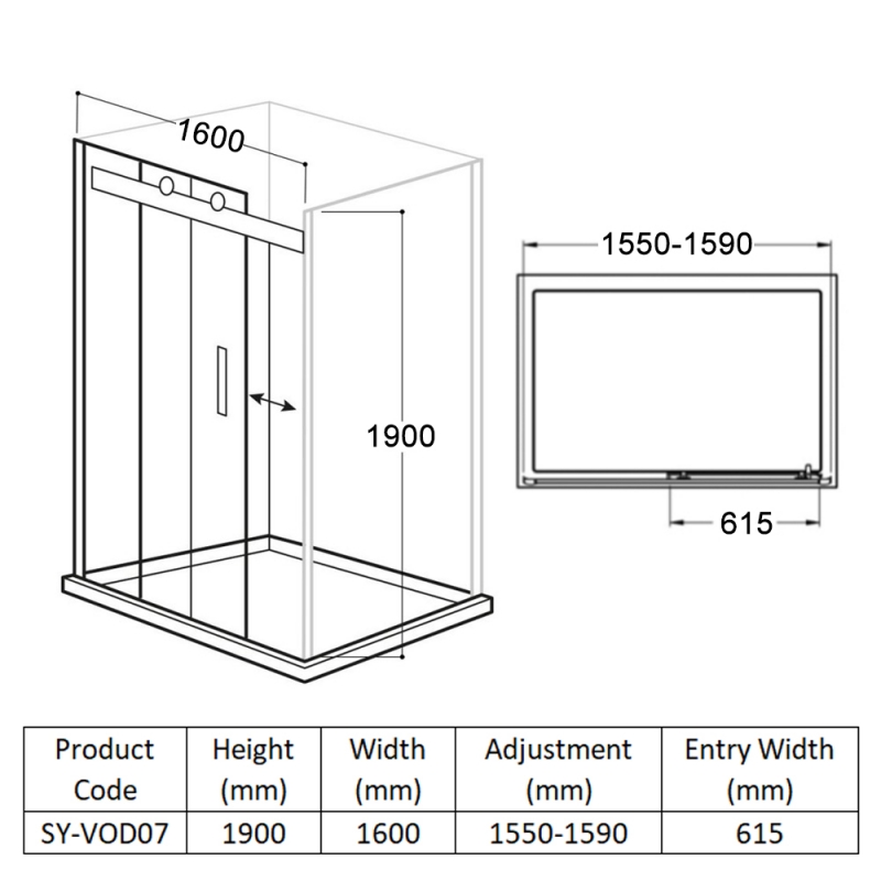 Delphi Vodas 8 Frameless Sliding Shower Door 1600mm Wide - 8mm Glass