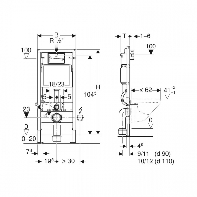 - Equipped with conduit pipe for feed pipe for connection of Geberit AquaClean shower toilets