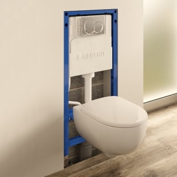 This Geberit wall-hung four-in-one pack contains a Geberit Duofix 1120mm Frame with a Alpha01 Round Chrome Flush Plate plus a Geberit Rimless Wall-Hung Pan & Soft Close, Quick Release Seat