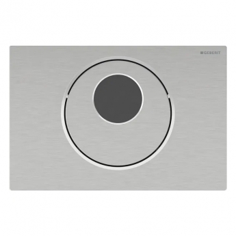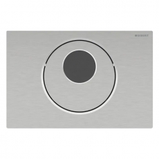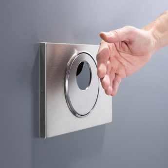 This electronic flush control set includes a mains operated infrared touchless Sigma10 stainless steel dual flush plate. The flush plate has a round window with a design ring for the infrared flushing mechanism.