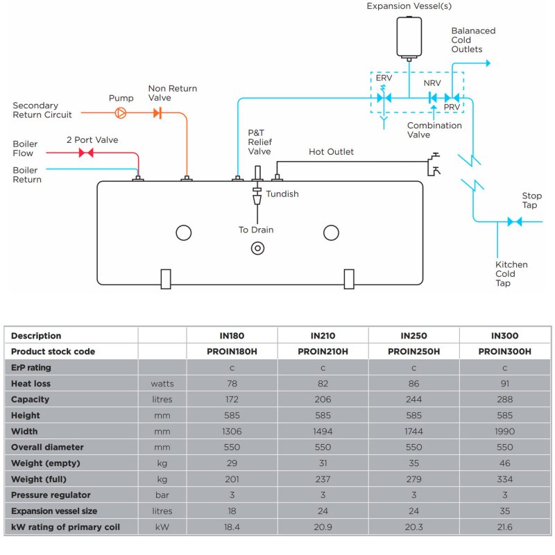 Gledhill Pro Horizontal INDIRECT Unvented Stainless Steel Hot Water Cylinder - 180 Litre