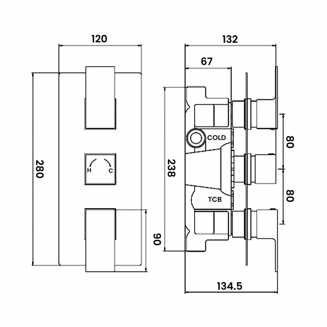- Top control operates two shower outlets, centre adjusts temperature, bottom control operates the other shower outlet