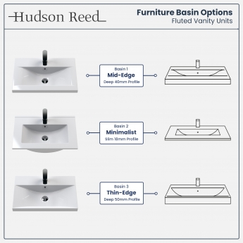 Eye-catching and functional in equal measure, the retro-inspired Fluted collection of vanity units boasts a corrugated-style front. Hudson Reed offer unbelievable flexibility with this cabinet, offering a wide choice of exciting colours, and 3 different basin choices to allow total customisation. Understated chrome finger-pull handles included as standard, with many upgrade options available.