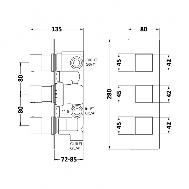 Hudson Reed Square Concealed Shower Valve with Diverter Triple Handle - Chrome | Thumbnail Image Hudson Reed Square Concealed Shower Valve with Diverter Triple Handle - Chrome