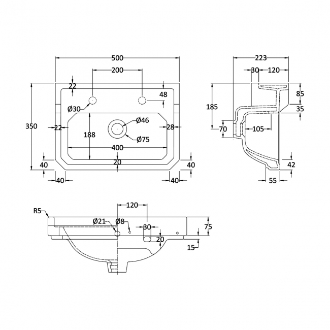 • Supplied with a pre-drilled 2 tap hole suitable for a standard pair of basin taps